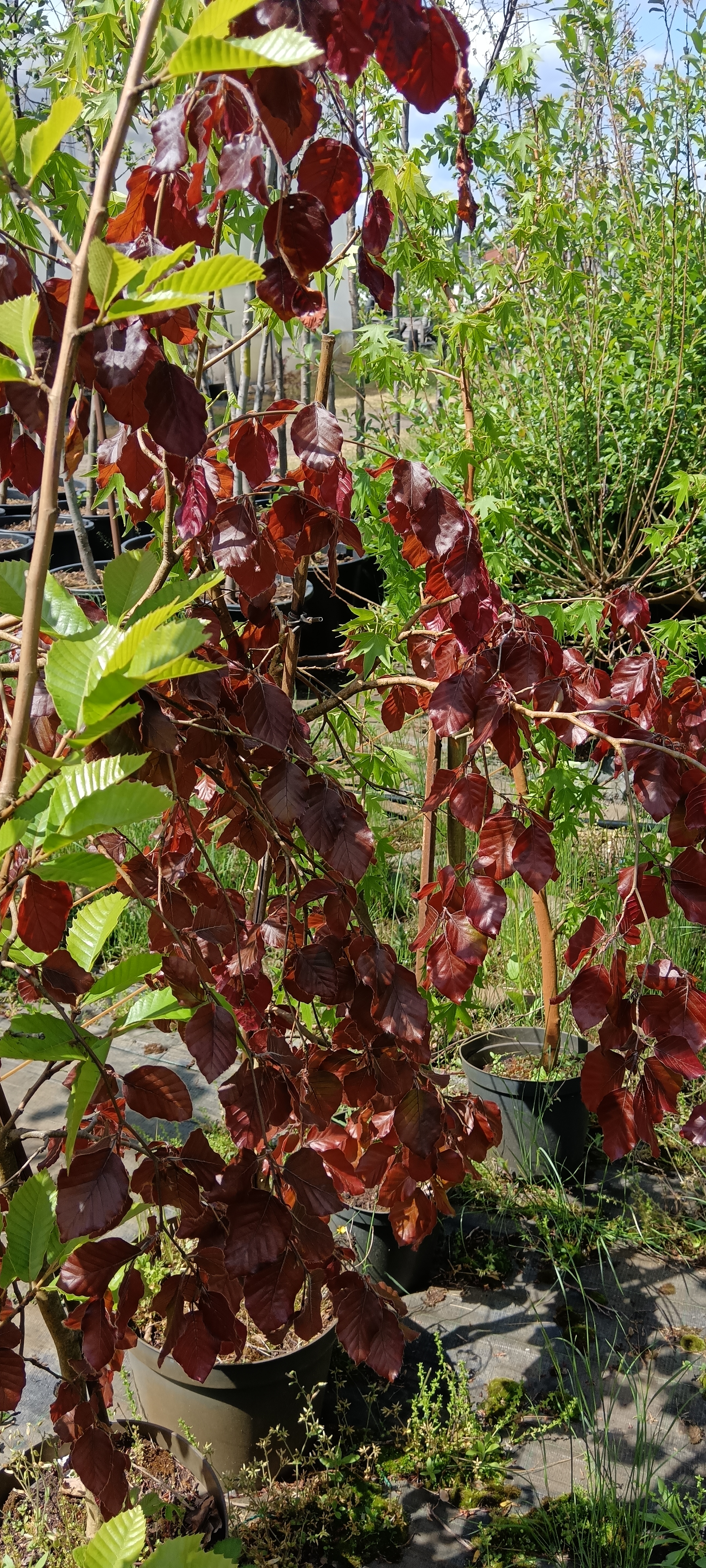 (Fagus sylvatica Purple Fountain) 8-10 m magasra növő, lecsüngő ágú, lombhullató fa. Levelei kihajtáskor sötétbordók, nyáron zöldesebbek, ősszel narancsvörös színűek. Szárazságtűrő fa, napos helyre ültessük.