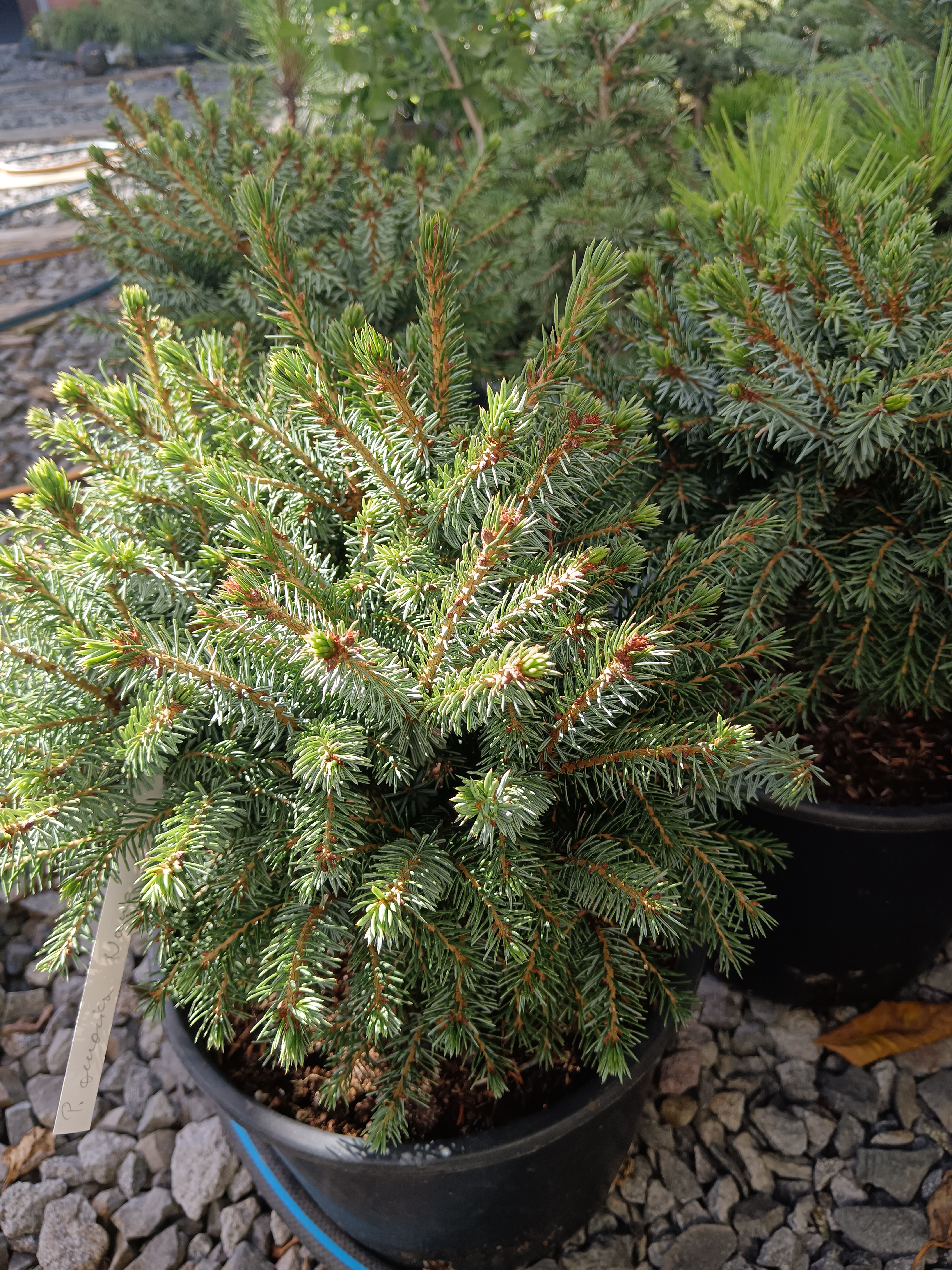 (Picea glauca Conica) Közismert, közkedvelt törpefenyő. Évente átlagosan 7-8 cm-t növekszik. Alakja szabályos kúp forma, felülete zárt, tömött.