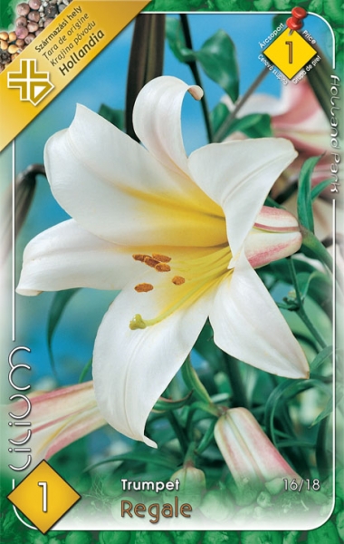 60 cm magas liliom, illatos, trombita alakú virágai júliustól nyílnak. Napos helyre, jó vízáteresztő talajba ültessük.