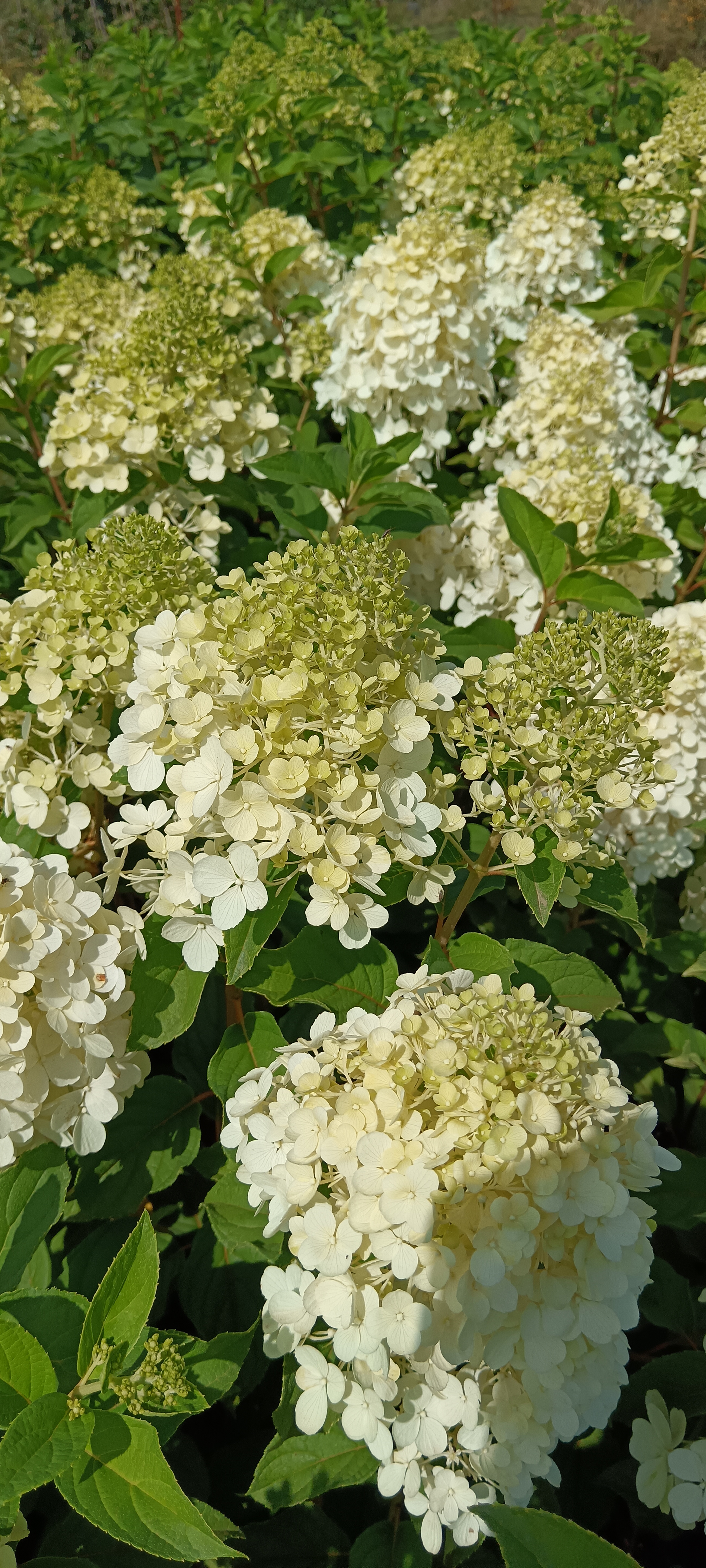 (Hydrangea paniculata Grandiflora) Nagy termetű, 1,5-2 méter magas cserje. Levelei nagy tojásdadok, virágai a hajtások végén július-augusztusban nyílnak. A virágok színe először zöldes, majd fehér, elnyílásban rózsaszínes. Vízigényes növény, mészmentes, humuszos talajban fejlődik szépen. Napra vagy félárnyékba ültessük.