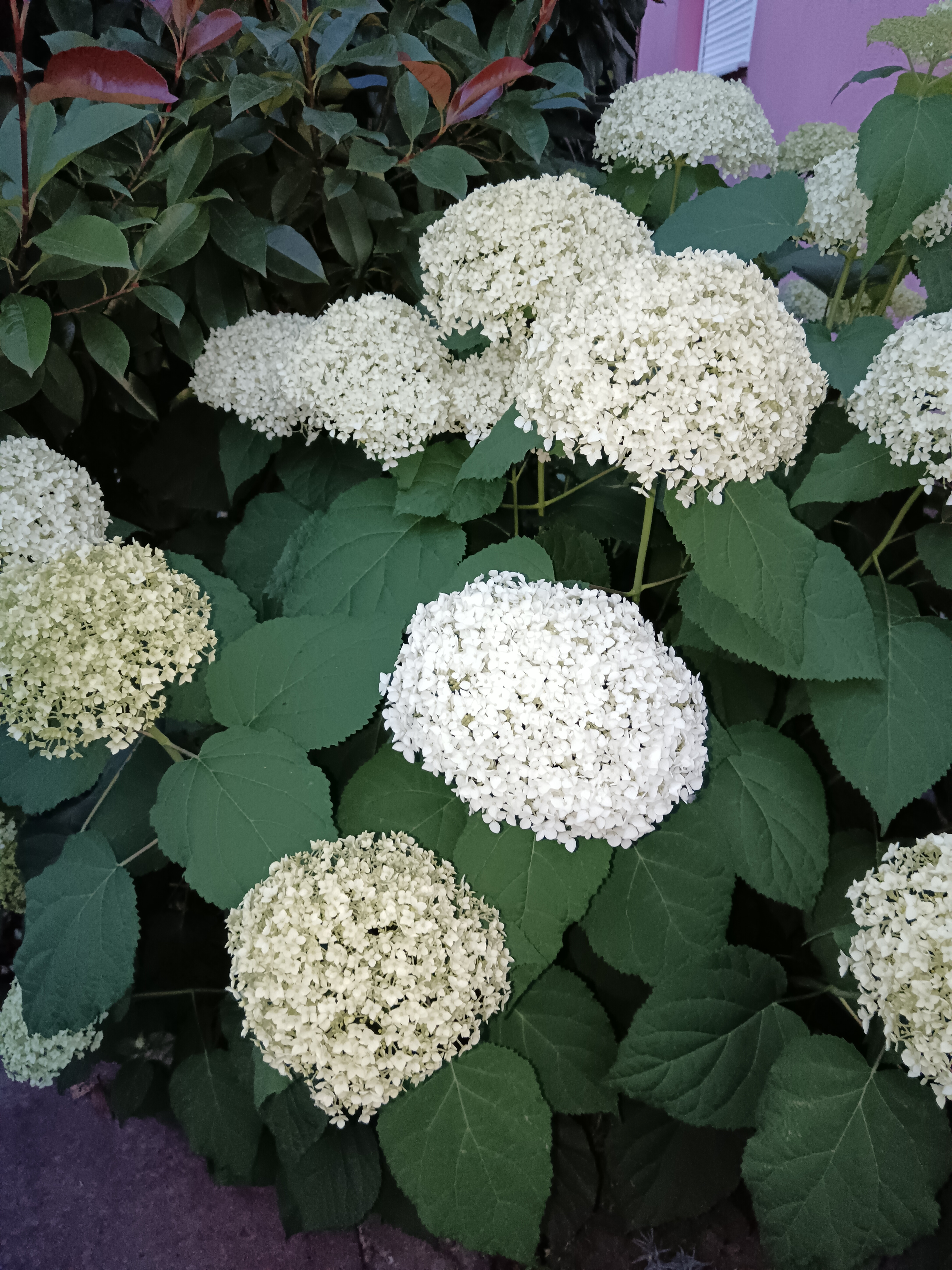 (Hydrangea arborescens Strong Annabell) 1,5-2 m magas cserjés hortenzia, fehér, kerekded virágai júniustól nyílnak. Napos, félárnyékos helyet szeret.