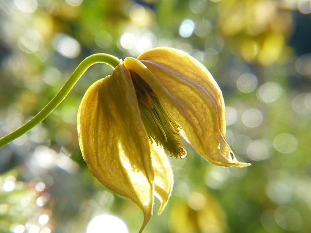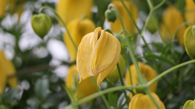 (Clematis tanguticaAureolin) Sárga, harang alakú virágait nyár elején bontja. Szereti a tápdús talajt, a világos helyet. Gondoskodnunk kell számára támasztékról. Télálló.