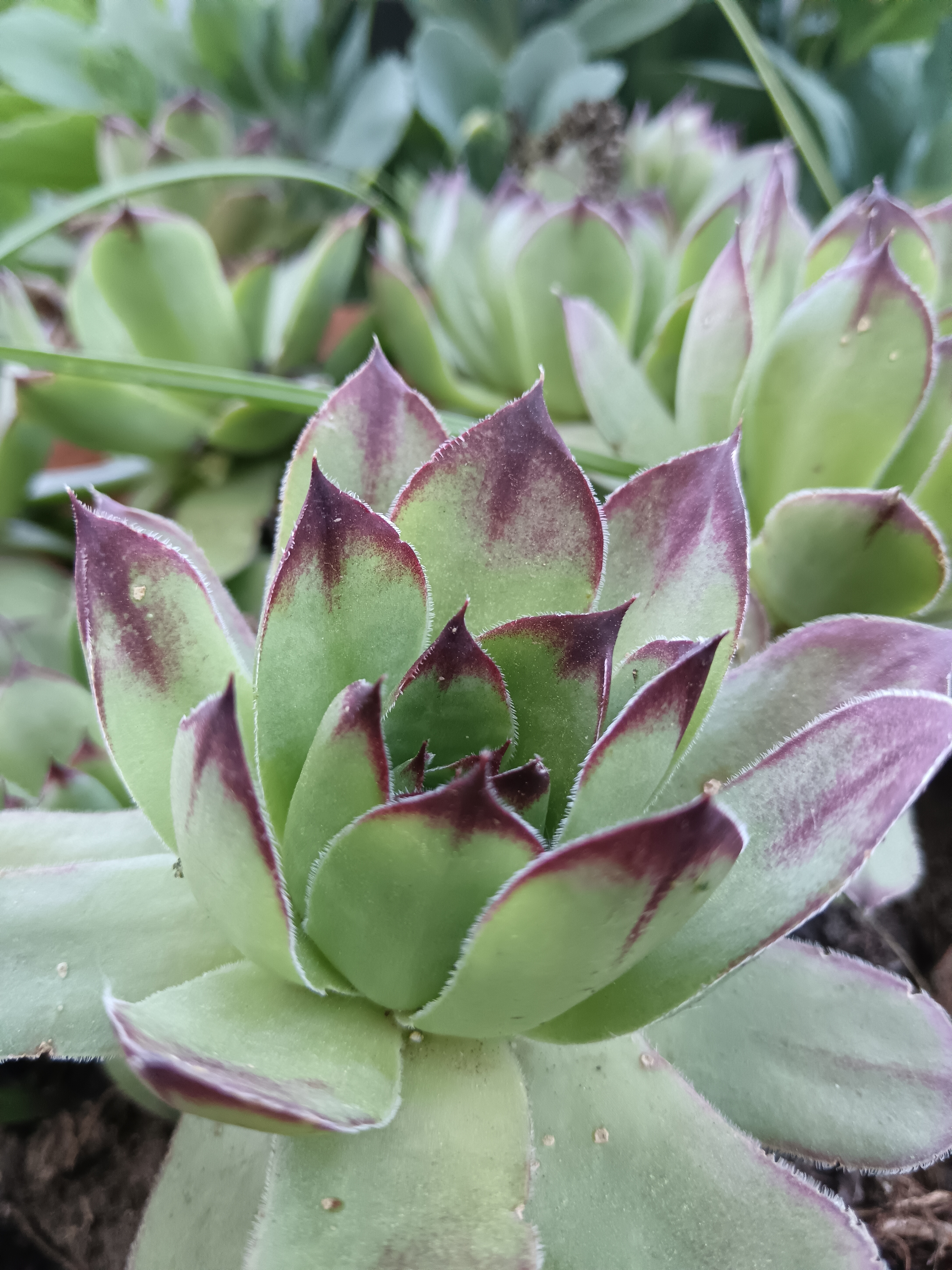 Zöld tőrózsáinak levélvége bordó színű. Télálló, szárazságtűrő növény.