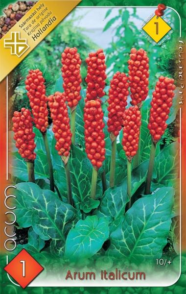 (Arum Italicum) 30-40 cm magas növény lándzsa alakú levelei enyhe télen megmaradnak. Narancsvörös bogyói nyáron (május-júniusban) díszítik, vágott virágnak is alkalmas. Árnyékos, félárnyékos helyre ültessük.