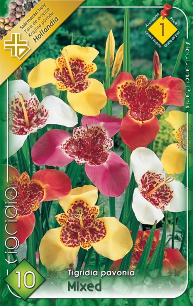 (Tigrida pavonia mixed) 50 cm magas, sáslevelű növény. Tarka, színpompás virágait júliustól szeptemberig bontja.