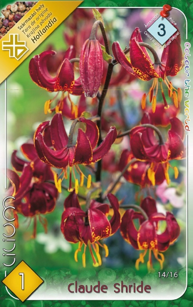 60 cm magas liliom, virágai májustól nyílnak. Napos helyet szeret, humuszos, jó vízáteresztő talajba ültessük.