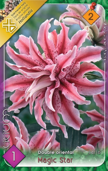 (Lilium Magic Star) 80-100 cm magasra növő liliom. Színpompás, telt virágait július-augusztusban bontja. Ültethetjük szoliternek, más liliomokkal együtt vagy évelőágyakba háttérnövényként. Napfénykedvelő, vízigényes növény.
